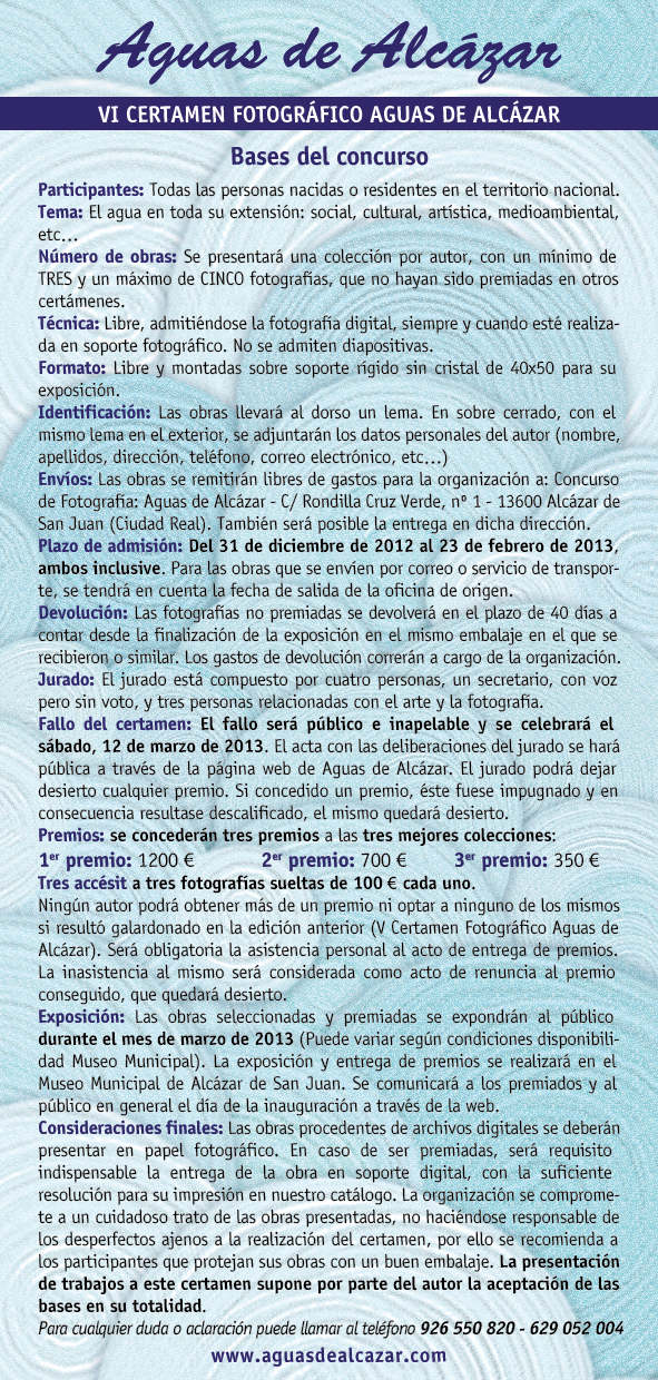 2 Enero 2013.- La empresa municipal Aguas de Alcázar acaba de convocar la sexta edición del concurso fotográfico que lleva su nombre y cuyo plazo de presentación de trabajos finaliza el próximo día 23 de febrero.